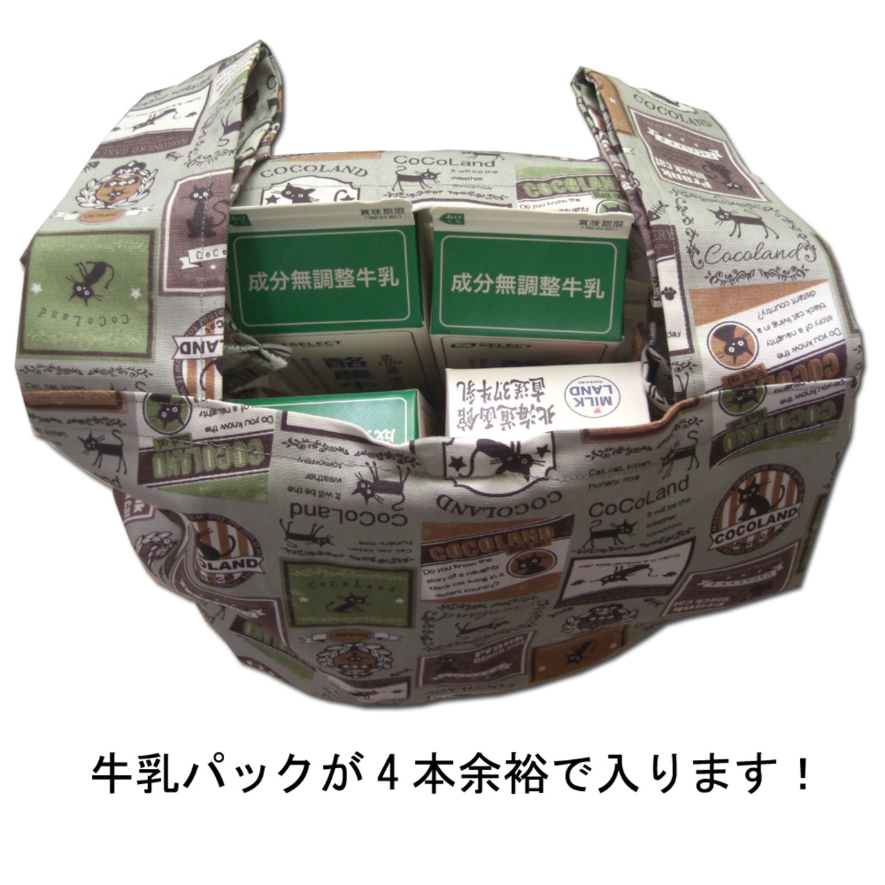 綿100%の丈夫なオックス生地を使用していますので、牛乳パック4本分も余裕で持ち運べます。